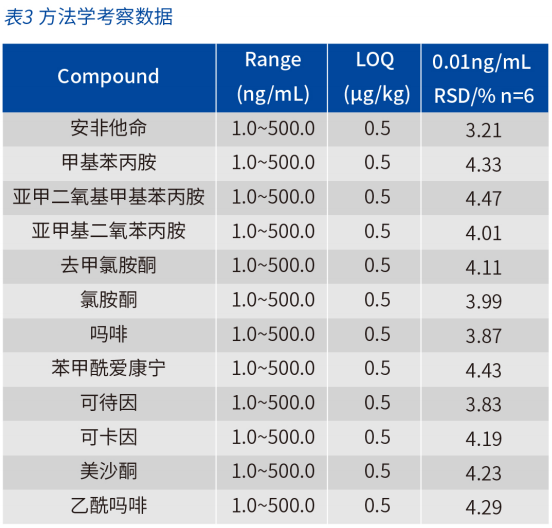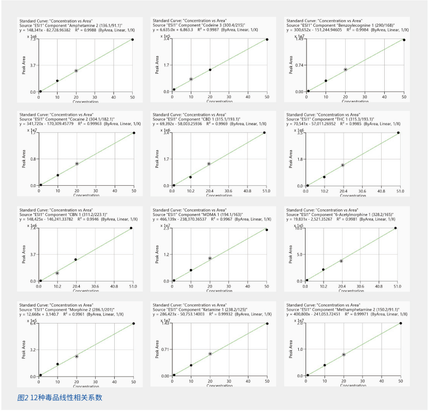 图1中展示了采用12种毒品的提取离子流色谱图,经色谱条件优化,各个化合物的峰形对称,获得优异的色谱分离效果,图2是12种毒品标准曲线,表3为相关系数和检出下限及重复性。