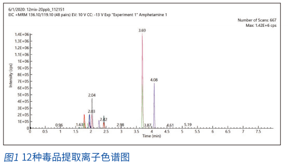 本方法通过简单、方便、可靠的固相萃取前处理方法,对样品进行提取和净化;采用软件已设置的毒品多残留筛查方法,一键式实现毒品筛查和定量分析;经实验表明,本方法具有良好的线性关系,灵敏度高,重现性好等特点,完全满足污水中毒品的筛查和定量定性分析要求;Elite EClassical 3200L-MS2 Vertical 9100 液相质谱联用系统:采用创新的离子源,保证大的离子化,从而保证仪器的灵敏度。结合离子源主动排废气设计、专利的 HSID 质谱接口以及反吹气设计,确保仪器处于洁净状态,大大提高仪器的抗污染能力,从而获得高灵敏度,重现性好的实验数据。