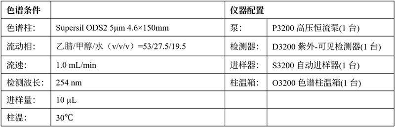 使用依利特新的EClassical 3200高效液相色谱仪,搭配Supersil ODS2色谱柱,能很好的检测出目标物,且峰形良好,满足定性定量分析的要求。