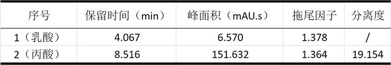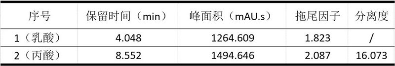 乳酸有很强的防腐保鲜功效,具有调节pH值、抑菌、延长保质期、调味、保持食品色泽、提高产品质量等作用,可经过丙酸氯化、水解得粗乳酸,再经酯化、精馏、水解得产品。依利特使用EClassical 3200高效液相色谱仪匹配经典Supersil AQ-C18色谱柱,对乳酸和丙酸进行分析检测。