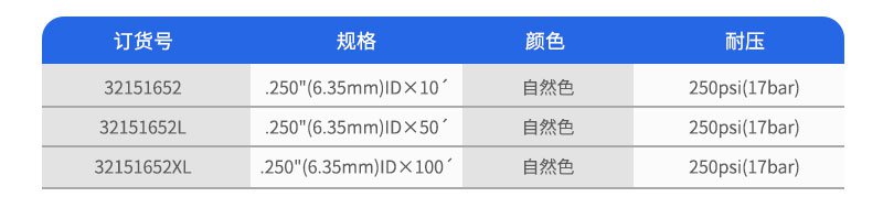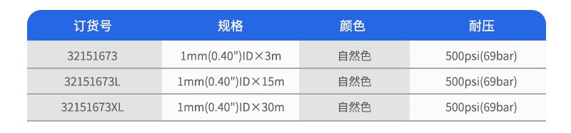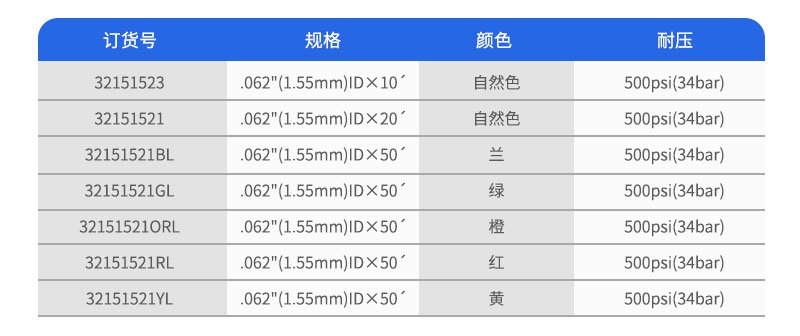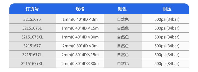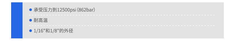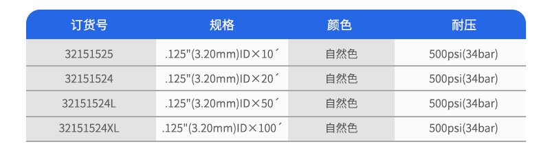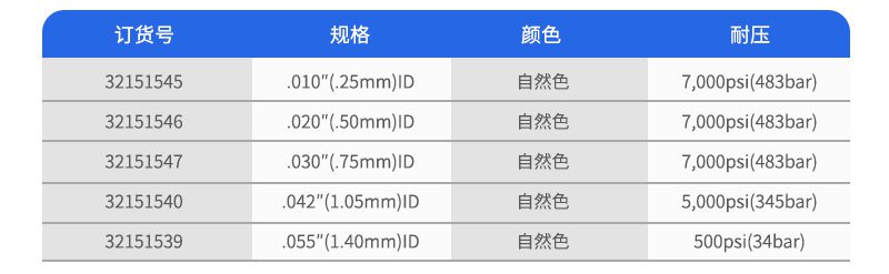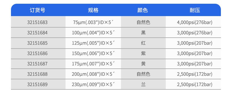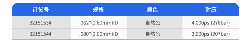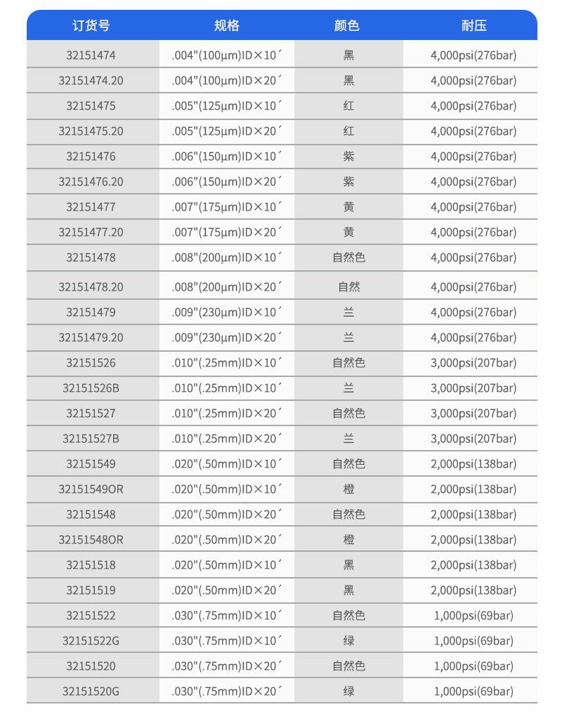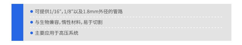 该种管有1/16"和1/8"外径两种规格,外径和内径的公差分别为±0.001"和±0.003"。这种聚合物材料在100℃操作温度下不会降低其机械强度。