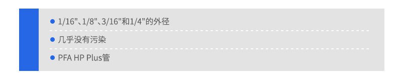 PFA HP Plus管是新产品,有1/16"和1/8"两种规格,该聚合物具有Teflon PFA HP管无法超越的纯度,而且对反复弯曲的承受能力更好,在含氟表面活性剂条件下耐用性更好。PFA HP Plus管比标准PFA HP管内壁更平滑、更光洁。