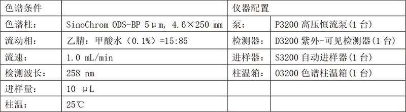 依利特新款的EClassical 3200液相色谱仪搭配经典的SinoChrom ODS-BP色谱柱,对芒果叶中芒果苷成分进行分析,柱效高,峰形好,满足定性定量分析的需求。