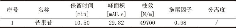 准确称取芒果苷标品10mg,用甲醇定容至50mL,配制成200μg/mL的溶液。再用甲醇逐级稀释成1μg/mL的溶液。