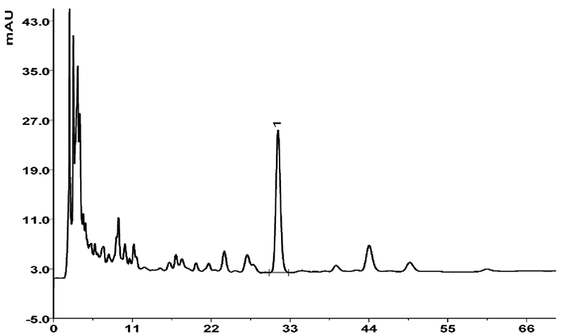 依利特新款的EClassical 3200液相色谱仪搭配经典的Supersil ODS-B色谱柱,对三白草样品进行分析,峰型较好,分离度高,满足定性定量分析的需求。