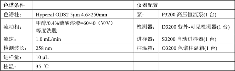 使用依利特新的EClassical 3200高效液相色谱仪,搭配Hypersil ODS2色谱柱,能很好检测出目标物,且峰形良好,满足定性定量分析的要求。