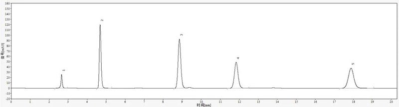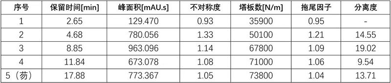 第400针的各峰的拖尾因子与第1针的各峰的拖尾因子比较。1号、2号和5号峰拖尾因子数据依然保持非常好,而3号峰和4号峰从数据上看拖尾因子略有变大,从谱图上看也能看出3号峰和4号峰似乎有新杂质检出。同一根色谱柱,1号、2号和5号峰拖尾因子数据非常好,而3号峰和4号峰数据,从不拖尾变成有点拖尾,有可能的原因是该实验持续时间比较长,而在这么长的时间内,3号峰和4号峰样品本身不稳定,出现了新的杂质造成。
