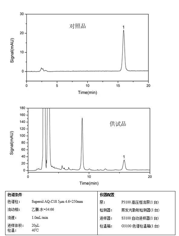 2.供试品溶液:取装量差异项下的本品内容物,混匀,滴丸取约0.7g,精密称定,置10mL量瓶中,加4%氨溶液7mL,超声处理(功率120W,频率40kHz)20~25分钟使充分溶散,放冷,用4%氨溶液稀释至刻度,摇匀,以1mL/min的速度加在已处理好的C18固相萃取小柱(500mg,先以甲醇5mL预洗,再以水5mL预洗)上,以水5mL洗脱,弃去洗脱液,再用甲醇2mL缓慢洗脱至2mL量瓶中,加甲醇至刻度,摇匀,既得。