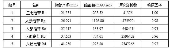 供试品溶液色谱图中,人参皂苷Rg1与人参皂苷Re色谱峰的分离度应大于1.5,理论板数按人参皂苷Rg1计算不应低于6000。